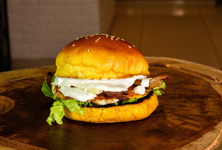 HAMBÚRGUER, MUSSARELA, BACON, OVO, MAIONESE DE ALHO, ALFACE E TOMATE NO PÃO COM GERGELIM.