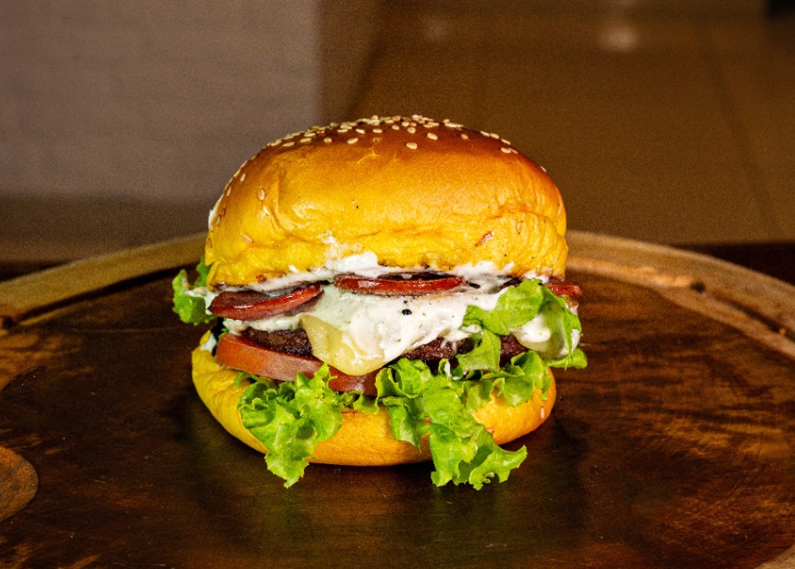 HAMBÚRGUER, MUSSARELA, CALABRESA, MAIONESE DE ALHO, ALFACE E TOMATE NO PÃO COM GERGELIM.